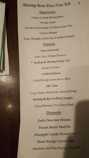 Atmosphere was pretty decent for a relaxing Saturday evening. Food was average Florida at best; which, equates to diner or bar food. Prime rib is something to pass on as they take NO pride in their approach. Cut is decent but flavor is lost in the preparation and storage. The au jus is very flavorful but it is prepared separately from the prime rib and is used as an attempt to cover up the horrible prep work, seasoning and storage care that they deliver in their bar food approach to cuisine. Their shrimp scampi is trash as well. They should rename it shrimp Alfredo and it would raise the dishs grade to average or slightly above average. Their ribs are worth skipping since they simply cut too many corners with this dish as well. Gas station rib shacks take more pride in their ribs then shrimp boat Brandon. Appetizers and desert were good but over meal quality is low to low average at best. Please note we have not tried their fried dishes but if they are as good as their fried appetizers then they are worth trying. ... good luck and hope Brandon and the Tampa area starts stepping their game up in the seafood arena. It is sad that most seafood in the area is on par with Long John Silvers fast food seafood strategy. Quick, cheap and barely edible.