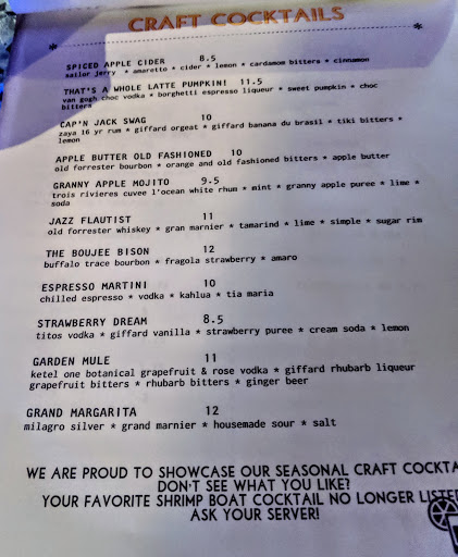 The Shrimp Boat continues to impress every time I go. The menu encompasses local and foreign ingredients and flavors. Definitely not a run of the mill seafood restaurant. The tasting menu featured on Saturdays is a prime example of this. First time I tried the tasting menu: Started off with a lump crab and goat cheese beignet served with a spicy sauce. Ive never had anything like it. Thats why I ordered 4 to go after the meal. Next was blackened swordfish filet served over crab fried rice. I asked to have my fried rice made spicy. The filet was cooked and seasoned perfectly. For dessert our server also asked us if we wanted a chocolate pave or would like to try the chefs new homemade ice cream. She said the chef had recently started to make his own sea salt caramel, and Belgian chocolate ice cream at the restaurant. So we opted for that considering everything else was delicious. We were blown away. The service was great and the food was amazing. It also recently relocated to a larger space, which is very elegant and makes the experience all the more enjoyable.