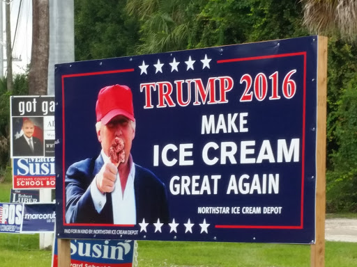 My family and I have gone here a few times in the years we have lived in the area. But havent been in a few years due to all the political stuff. Back when they were just campaigning in the election it was bad in there. The sign has kept me away. ice cream was great before Trump and will be great long after he is dead. He had nothing to do with it. But this is what will keep me gone for ever: pdrummz 6 reviews・1 photo ★★★★★ 8 months ago I have to be perfectly honest, the place is not clean. It smelled like old stale, fried food in there. It really needs a complete gutting. Most of all, the ice cream tasted funky. My wife threw hers out. Sorry, but we will not be returning. 12 Share Response from the owner 8 months ago He is probably a hillary supporter and didnt like the idea of my free TRUMP BUMPER STICKERS and my TRUMP SIGNS EVERYWHERE This is no way to run a business.