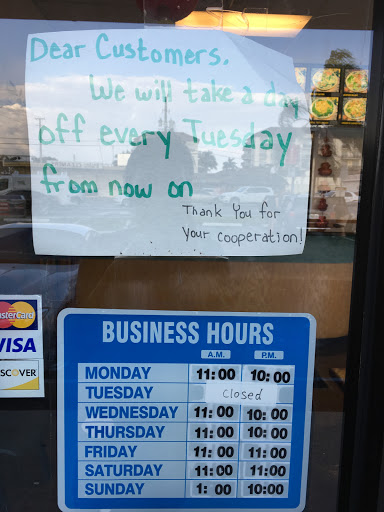 | Working: | 11AM–10PM Closed 11AM–10PM 11AM–10PM 11AM–11PM 11AM–11PM 1–10PM |