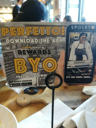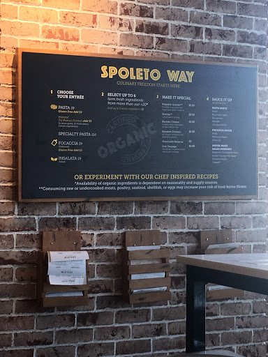 Spoleto is one of my favorite quick Italian restaurants. The concept is simple. Select your pasta, select the items you want to mixed in and the Spoleto chefs saute, quick boil and or bake your pasta dish. If you are interested in trying other combinations, Spoleto has pre-selected items you can order. Save room for the Nutella dessert. Its delicious. Eat in, take out and outdoor seating is available.