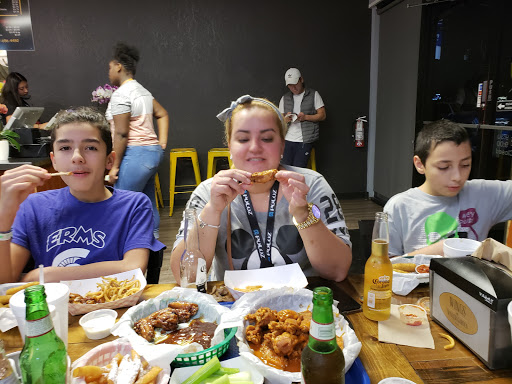 Wings were very high quality chicken and cooked to order. I tried both hot honey garlic (due to recommendations here) and the Mother in Law (their "above hot" spicy level). Hot Honey Garlic were tasty; honey and garlic were both noticeable with neither being overpowering. The Mt In Law wasnt as spicy as I expected. They tasted fine, and with a little ranch on them they were great. The place is decorated very oddly, with these bizarre 80s posters on the wall that have nothing to do with anything (I think one was a tiger). They have two pinball machines and a racing arcade game. The girl that took my order was rather grouchy and answered my questions in 2-3 word answers. She didnt smile once and didnt thank me for my order. Maybe she was a football fan and wanted to be at home watching football on Saturday, I dont know. The fries have so much potential-- fresh cut shoelace style. However, they were underfried and not drained well. I got my order to go, and by the time I drove back home about 15 minutes later, the wings were perfect but the fries were a soggy, soft, oily mess. I had to throw them in the oven for 10 minutes at 350 degrees to get them warmed and crispy. Dont bother ordering fries here; go for wings. Or, go for phones since it has a small boost mobile store inside the restaurant for some odd reason. Also, either someone that worked there or someone friends with someone that worked there was eating in a party of 5 or 6 friends in the dining room; he kept walking in and out of the kitchen from the dining room helping himself to celery, dressing, and other things, which was pretty unprofessional. He wasnt back there long enough to wash his hands before touching the food, so Im not sure how sanitary things were back there with him chowing down one minute, then wandering back there to help himself and his friends to more food the next. Kind of disgusting, but I guess Im not expecting a five star dining experience from a place with missing letters on the marquee that has a boost mobile inside of it. So, 4 stars since the place delivers on its mission of making tasty chicken wings, -1 star for shitty fries and nasty ass customer/employee helping himself to the kitchen while eating.