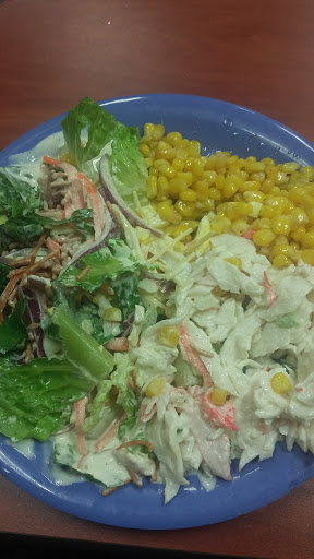 salad bar Right after the lettuce they have the salad dressing - wierd - then the toppings. No green olives. Seen some mold on a strawberry and a few were bruise. From the grill The teriaki steak was rare which I am not a fan of but still tasted very good. The salmon had a very strong fishy taste, but was still good. The spicy shrimp was cold and had a lot of breading. All the other food was good, nothing outstanding to really cover the high price. The vegetables looked over cook and did not want to try them.
