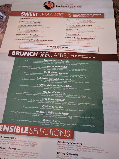 I had a perfect experience here the other day. I had my one-year old with me. She was not on her best behavior, but rather than getting dirty looks from the staff like I usually experience when she acts like that, the manager came over and talked to her and everyone was very understanding towards my cranky toddler. Melinda was our server. She was very delightful. We started our meal with a Monster Cinnamon Roll which was the perfect starter for my sister and I. It was delicious! After we enjoyed that start to our meal, I had the Floridian which is an omelette with crab meat. I am more of a traditional breakfast kind of person, but after seeing the menu I was stuck between the lobster and brie omelette or the Floridian. After asking which was Melindas preference, she assured me the Floridian had a bit more flavor and it was TO DIE FOR! Probably the best omelette Ive ever had honestly. I also sprang for the upgraded Mediterranean potatoes which could not have been any better. They are an explosion of flavor in your mouth, and cooked to a crispy preparation. I dont recall the name of my sisters breakfast, but she also really enjoyed her food. As I said, I am a more traditional breakfast kind of girl, and stick to hole-in-the-wall diners most of the time, because chain breakfast places are usually overpriced and disappoint. Thank you very much ABEC for the wonderful experience and the delicious food!