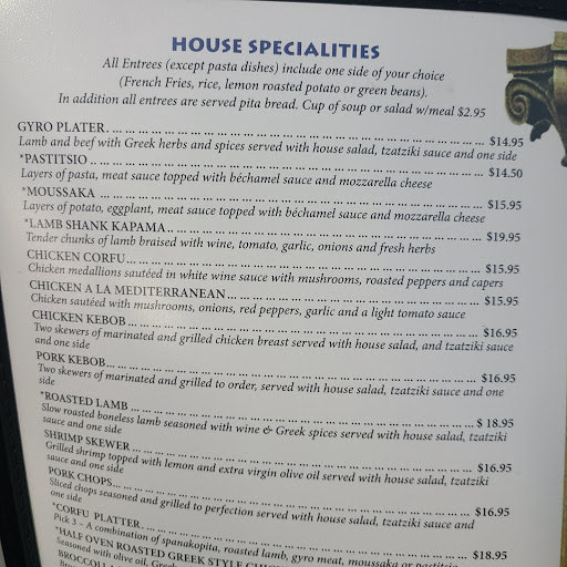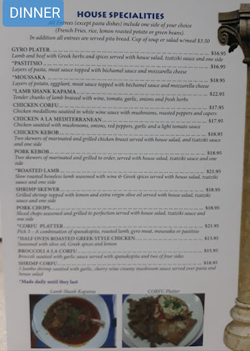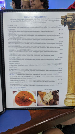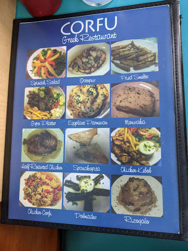 This restaurant is a great place to eat no matter what time of day. Rita and Arthur are very friendly and always take care of me. They have a variety of great dishes, there dessert is excellent and they also have an excellent selection of wine and beer. They corfu platter is great you get to pick 3 items and its inexpensive compared to other places. Before I went to corfu I use to eat at a greek restaurant in orlando and the price was much more expensive and the quality was not as good. These people make there food with pride, knowledge and expertise. If you are looking for a place to try out with your family, or even just a good gyro or chicken gyro to go, this is the place for you!