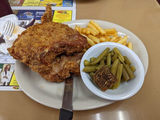 Your typical greasy spoon, with the exception of having an extremely basic salad bar. Service was friendly, there was a quiet atmosphere, and it was a bit dirty (but not awful). I ordered the NY strip steak, mashed potatoes, and green beans. Most meals come with a little scoop of ice cream at the end-- a nice little finish to the meal. The meal itself was good. Youll also get to enjoy the John Wayne decor while you eat, so thats a neat little plus.