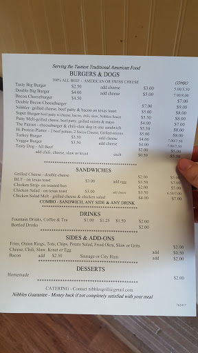 My wife and I found Nibbles about six months ago and DANG, we wish wed found it six years ago! GREAT breakfasts, unbelievably good hamburgers and the prices are perfect. Along with the food, its the conversations and home-town feel that make this our absolute FAVORITE restaurant within 100 miles.