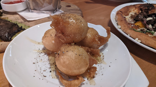 Cute little wine bar. Not busy at all when we went on a Sunday evening. Waiter was very friendly and helpful. Interesting wine selection with less mainstream options. Several choices for flights of whites and reds. Highly recommend the goat cheese beignets and the cheese plates with honeycomb and a tiny knife.