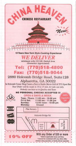 If youre in the hurry for great take-out and fast delivery dont pass up China Heaven! The food is excellent and reasonably priced.