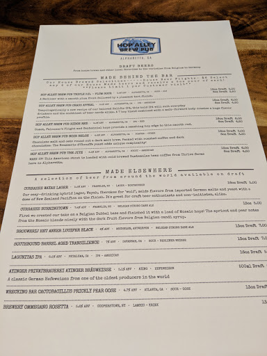 We love downtown Alpharetta and love the restaurants there - except this one. We will not be going back to Hop Alley. I suppose if all you care about is the beer, maybe its worth going there. If you want good food, go somewhere else. My husband had two beers. They were ok, but we arent beer connoisseurs. We ordered the hummus appetizer. This hummus had no flavor and the vegetables were a joke. I cant believe anyone would send vegetables like that out of their kitchen. The carrots were so dry and the celery was brown. Seriously. We also had the pimento cheese crostini. The pimento cheese was outstanding, however, the bread was stale. Hard. Impossible to chew. Who sends food like this out of their kitchen? We also ordered burgers. They werent bad, but not worth going back for. The Gouda mac n cheese was awful. Flavorless. The onion rings are not awful, but not good either. Again, if you want good food, go somewhere else. For a beer and a burger, I guess this place would be ok.