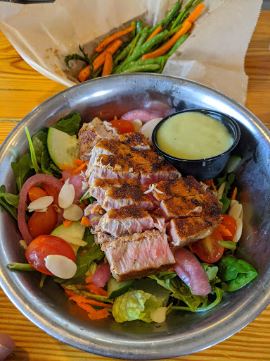 I have two small boys and we LOVE this place! For under $6, children can get a FULL portion of many different entrees, along with an organic juice box, a tiny brownie, and a side item. One of my boys got a cheeseburger that was the size of an adult portion. The large Greek salad isnt very large, but was plenty for me. Their vinegar dressing is wonderful... Meals can be pricey, as you pay separate for the entree, and then an additional amount for each side, but it is worth it for the location, atmosphere, and food. The servers are ALWAYS very friendly and helpful. They have 5-6 outdoor picnic tables. When the weather cooperates, this is the place to be!