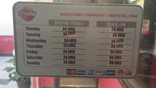 I dont visit often since Im not usually on this side of town, but when I do, its always the drive through. So, I cant speak as to the inside part of this location. Generally, the drive through is pretty quick and has always been accurate for me. The people have always been nice, as well. The food is fresh, though they have to make my burgers special (dont like pickles). Other than that, its a Krystals. If you like their food, youll like it. If youre one of those people that inexplicably dont, then you probably still wont. Ya weirdo.