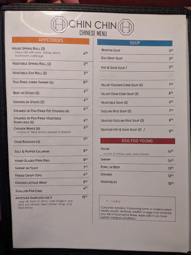 Great food and great atmosphere -- at a great price. My wife and I recently ate at Chin Chin with a friend; and I have a feeling it is going to become our go-to Chinese restaurant. The food is high-quality and delicious, and the lunch specials are particularly affordable. (As of December 2011, lunch for two -- drinking water -- cost less than $15!) Youll note that my only "Dislike" is the soup. I ordered won-ton soup, which was acceptable but not particularly great.