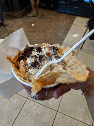 Worst ice cream place ever! When we walked in it smells like dirty trash sitting around. Then I noticed my husbands ice cream had hair in it go back in the get a refund and the 3 girls behind the counter are trying to figure out whos hair it is no one apologized at all! No hairnets or gloves were worn as well as not one of then washed their hands between fixing orders and ringing up customers! Very unprofessional and unhealthy!