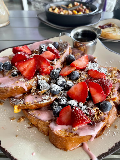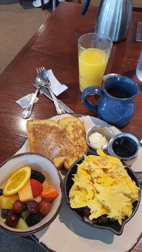 I thoroughly enjoyed this place. The ambiance and vibe were cool and who doesnt LOVE free parking in Atlanta!!! The parking deck is accessed from either 28th or Palisades off of Peachtree. The servers Jennifer and Rachel were prompt and friendly. They both took good care of us. I ordered the Egg-ceptional Skillet Combo with bacon, sausage, and cheese. It also had potatoes and eggs. I substituted the bread with a pancake. Omg!!! The pancakes are the best! I ordered a side of grits as well. The grits probably would have tasted better, had they have been hot! The server brought me out another bowl but it wasnt hot either. I really liked the Rum Vanilla Coffee and Strawberry Orange Juice, although I didnt taste strawberries and it was served room temperature. My friend ordered the Prime Rib Skillet and got blueberry pancakes on the side. She really liked her food. Overall, it was a great experience and the food was delicious....They lost a point because of the room temperature juice, warm grits, oh and they forgot the green peppers in my skillet....