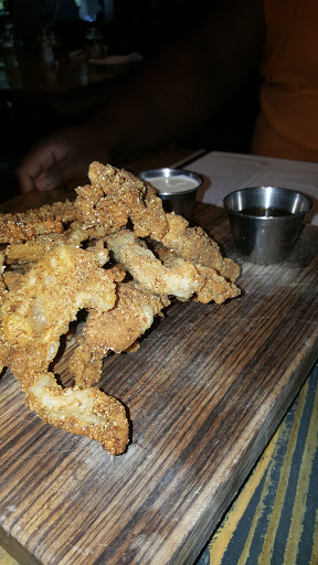 Food is crazy salty as in cured in salt and or pickled. As mentioned by others portion sizes are a joke. And way over priced for what you get. The atmosphere was really cool. The waitress was friendly though anyone not used to heavy accents could not understand her. Personally i enjoyed her I think Russian accent. They took awile to get drinks out. We all had water so i guess it want the end of the world waiting for out alcohol. One of our party of 12 got to sample some whiskey. It was cool of the bar manager to do that. They have some interesting food options like chicken skins for 6 bucks. Or a single piece of alvacado toast with salted salmon for 8. The 12 meatballs where soaked in vinegar and that was their spice. Yuck. Grilled cruch salad was very good. Fried green tomatoes where good. The waitresses substituted shrimp for the clams in the pasta. Wife enjoyed it minus the crazy hard salt cured sausages in the dish. The chocolate cake was very large and very very rich. It was great you just need to share it because its so much richness for one sitting. The fries that come with the sliders are great. Though the three sliders were again half the size of what you would get at burger king. Overall I expected more from a culinary standpoint for the price.