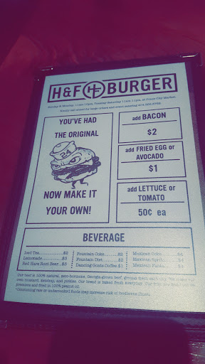 H&F burgers are okay but nothing special. You can get a burger that is better or at least as good for less money. At many of the other burger places in Atlanta, e.g. Vortex, Grindhouse, Flip, etc. To make things worse the service is horrible and you have to deal with the bad attitude of the staff.