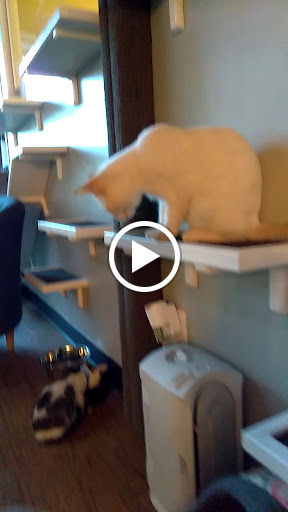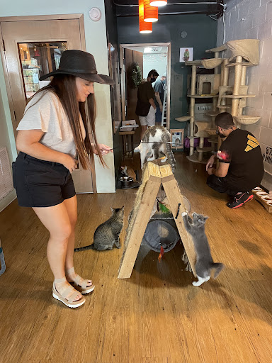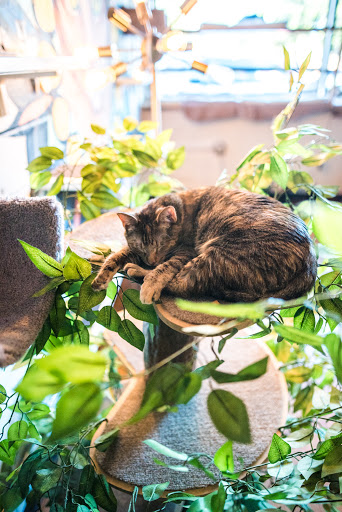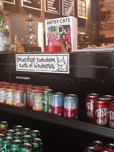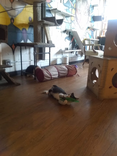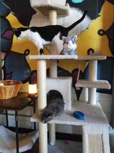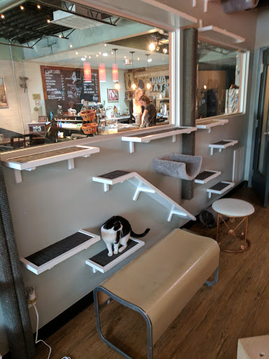 Good coffee with both almond and soy milk as dairy alternatives for those of us who cant have regular milk. The cat room is separated from the cafe with a large viewing window in between, so you can still watch the kitties play (or nap) without paying for a spot in the kitty room. To get in the kitty room, its smart to make a reservation as they allow 10 reservations per hour slot plus 2 walk ins. When my husband and I went in, there were 12 or 13 cats, but a handful were ready for a nap. They do specifically have a cat nap hour from 4 to 5 and I remember the employee mentioning another earlier in the day as well. They also have a small room with litter boxes that can be closed off with kitty access only through a cat door for the cats to escape to as well as several shelves and perches near the ceiling if they need a break. I definitely recommend this cafe for coffee lovers, cat lovers, or just anyone looking for a new and unique experience.