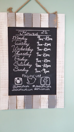 Java Cats is definitely one of my new favorite spots! My boyfriend and I went on a Thursday afternoon and it was wonderful. From the time we walked in and got our coffee (which is delicious), to the time we left, we were greeted with a friendly staff and playful kitties! Reserving your 1 hour time slot is very easy and convenient. We were able to stay a little past our time since the place was slow during the time we went. Some of the cats were napping, but we got to play with each one at some point and they are CUTE!!!!! I love the mission of this place and the layout where you can watch the cats from the large window as you enjoy your coffee! It is a very chill hangout spot it is super trendy. The parking is limited, but we didnt have trouble finding a spot when we went and it was such a fun date spot for my cat loving boyfriend and I. The place is clean and the cats have plenty of room to play. And did I mention that there are NONE of the original cats there, thats right, they have ALL been adopted. Come check this cool new place out and adopt a cat!