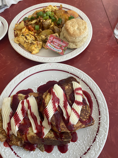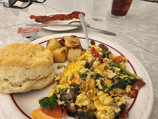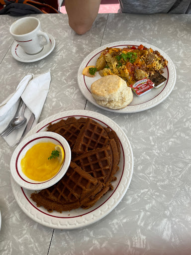 Great breakfasts are served here. The scrambles, biscuits, pancakes, and everything else I have had here is great. The atmosphere is kitchey, 50s diner. Service is reasonably fast given how crowded they get. Of note they only accept cash. There is an ATM on site and it does not have ridiculous fees associated with it.
