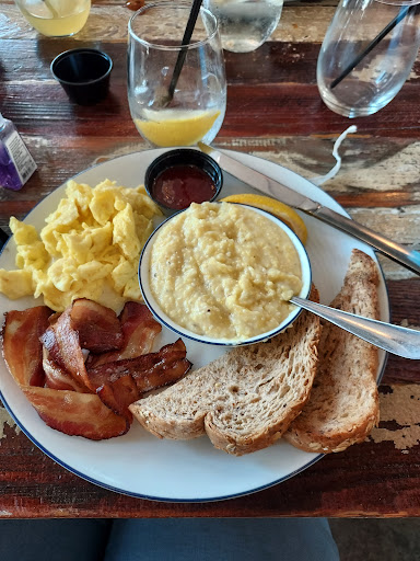 [Time & Date of visit]: Saturday morning - 11ish [Party Size]: 4 [Location/Ambiance]: I would say its a quaint cafe. The patio section highlights the shared strip with other business. Parking can be a bit cramped when you arrive at a busy hour. Two of my cousins arrived around 10ish, and they informed that there was not any lines for food whatsoever, as well as a good amount of parking space left. If the lot is full, pass the stop lights, make a left after the intersection and there are some available parking spots on the street. [Service]: Its a fast casual kind of setup here. Pick up your drinks BEFORE you order! Then, after grabbing your table number; pick up additional silverware that are all bunched up for everyone else to touch. Ehhh. The food runners can also bring any additional condiments if needed, once they drop off your food. Since it was packed by the time we all arrived and placed our orders, we sat at the counter. I believe it was the manager and one of the cooks, came to check up on us at separate times to see how we were doing, what we thought of the food, and what else they could get for us if we needed anything. [Food Highlights]: The Grit Stack w/ Chicken Sausage - If you grew up in the south or are a big breakfast person, this is definitely the item to get... unless you are allergic to shellfish. Then I guess, more for us! #sorrynotsorry. Im glad they actually mash up the chicken sausage into this, creamy, gooey cheese, mixture. The grits alone are creamy, and the right amount of seasoning. Maybe better than flying biscuits. I think choosing the bacon would have overpowered it on the salty factor though. Must try. The Wild Wes - (Panino) w/ pasta salad My best-est ordered this one. She likes mixing things up, and the combination of the tangy bbq sauce in the sandwich and then dipping into the ranch on each bite was right up her alley. I preferred the sandwich as is. The medley of tangy from the bbq sauce, with the salty flavorings of the bacon and light tones of the cheddar all came together just right for the chicken in the right combinations. Good recommendation. We wish the pasta salad was up to par, it was more of a meh. Not any real taste to it. I would pass on this as a side. French Toast Sandwich - I didnt really get to taste this, but my other cousin tore this up. For anyone really hungry with a big appetite, this is good sized meal for brunch. The included banana dessert cup, comes in a standard size metal ramekin / dipping cup. - Im not fond of bananas myself, but my best-est said it was delicious. Orange Juice - Im not sure if its fresh squeezed, though there wasnt a ton of pulp. Pretty refreshing. [Total Bill w/ Tip & Tax]: W/ two OJs - $26.95 {Summary}: I think a total of 3 of us had this place bookmarked for a while, and it did live up to the other reviews. I would recommend this place, even more so for someone visiting out of town if they are big on breakfast / brunch.