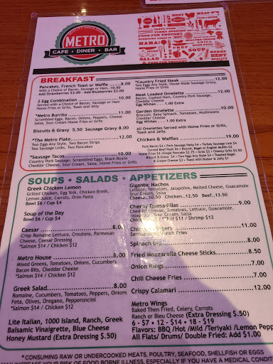 Just left this place and it will be my very last time. I lost my entire appitite dining at this place. I didnt eat a single thing and got it to go after it sat there for 20 minutes in my face. This is why: Your "Staff" isnt too great at that thing called customer service. If they were they would have asked the couple screaming and cussing about their relationship problems in the middle of a nearly full room while everyone was trying to eat to quiet down or leave! Every last waiter walked right on by them like they couldnt hear them! It was REDICULOUS! They sat right in front of us with all of the noise and was so loud they gave me a HEADACHE before my food came out. I went to the bathroom due to the nausea that was following the headache and not even 1 minute later some is pulling on the locked door to enter. I say "Im almost finished" and this person waits a few seconds and does the same thing even harder frightening me to the point where I screamed "Someone Is In Here!" The response I get? "Well speak the F*** up then, damn" I then hear someone talking and laughing with the waiting person and the waiting person replies with "No, she has a baby ass voice" a few seconds later I open the door to leave. Come to find out its SECURITY that is pushing herself into the bathroom after me. No eye contact, no apology for the way she was talking to me, nothing. I get back to my seat and ask my boyfriend who the security guard was talking to when I was in the bathroom since he was facing that way the whole time a little ways away and he says it was a WAITER. Were not in an empty room, obviously a PAYING CUSTOMER is in this LOCKED WOMANS bathroom so why would you security pull on the door so hard I thought you were going to break it? Waiter why did you just let her do that and laugh instead? Did I mention when I got back to my seat that couple was even louder and even more people are quietly watching and shaking their heads but NO ONE still hasnt said anything to them!? Where was management? Idk, but there were 4-6 servers that I repeatedly watched, heard and served the screaming couple and they too were silent. I had enough. Obviously this is normal here at metro diner and they made it VERY hard for me to EAT my food. I ended up paying $35 including a TIP for my uneaten food and half of my boyfriends food. They gladly gave me to go containers but not one asked why we didnt touch MAJORITY of the food. Just TERRIBLE.