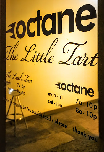 Pros: Great coffee, cool vibe Cons: The store is divided into two business: The Little Tart and Octane, so essentially you wait in one line for coffee while someone holds up the second line for over priced tarts. Also, its the only place where the cashier will talk to a customer in front of you in line for 5 minutes while you patiently wait for a simple coffee. One size coffee and its $$ 2.71. I understand paying more money for "locally" purchased and sourced coffee, but $ 3 for a small coffee that drips out of the lid consistently...? I am good for now.