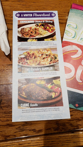 The circumstances of this visit were different from my other experiences at On The Border. Atlanta had just suffered from snow and ice which shut most of the town down. I found On The Border open and is sounded good to me. Unfortunately due to the storm they were short staffed and they were only serving their lunch menu. My favorite items are not on the lunch menu so I settled for one of less favorite items the taco salad. I also ordered queso which came out at just the perfect temperature for enjoying and the chips were cooked right making for a yummy combination. The Taco Salad was not as good as usual not really sure what was wrong may it was just not what I wanted at the time. There were not many people there so the staff was not challenged but the service was friendly and quick. The parking lot could be a real challenge to find a spot on a busy day as even with very few people there I had to park a little way from the entrance. I would have rated it better but the prices are constantly going up and with a premium price I expect a premium product; and sometimes On The Border falls a bit short on their food quality. I still go here because even when it falls short a bit it is better than most mexican resturants.