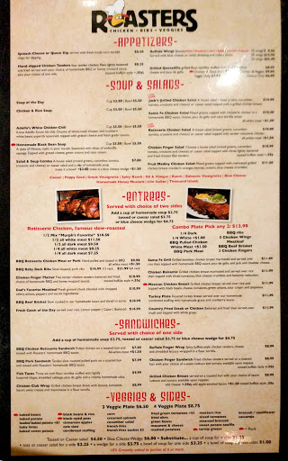 Roasters cant be beat! Weve been eating here for at least 15 or 20 years. The food is consistently great no matter what you order and the people are like our best friends. The place is Known for its chicken fingers, BBQ ribs, 20 or 30 vegetables, and so much more.