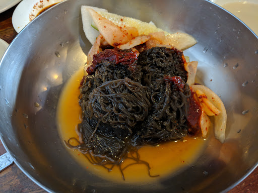 My son, the chef, brought us here for a birthday meal - what fun - stuffed at the end. Many appetizer plates come with the meal with kimchi, pickled radish, this and that, and a fried fish - quite tasty. The tofu soups appear to share a similar broth but have different add-ins and come bubbling in a pot to the table when the waitress cracks a raw egg into each bowl - wonderful. We had the scallion pancake, thin slice beef rib and a cold noodle dish - all good.