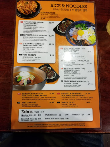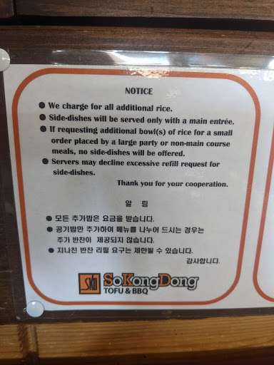 My husband & I was in the area & thought wed find a decent Korean restaurant to have lunch at. Saw the 4.5 stars but didnt have much time to read all the reviews. We were like 3mins away so we figured why not?While waiting for our meals I went to use the bathroom. Luckily, I checked for toilet paper before using the bathroom. Washed my hands & went out to inform one of the employees that the womans bathroom was out of toilet paper. I then walked back to my table, turn around & shes right behind me. Not sure why she followed me. I repeated to her that the womans bathroom needed toilet paper. She responded "sorry, we only have one bathroom"...??? dont think she understood me.. anyways, the food we ordered was pretty good but definitely not worth the money(portion wise). I dont think Ive seen a bowl of bibimbop so small unless thats the sz they serve with just the combo meals. Still, definitely not worth the money. Then theres the "no excessive side orders" signs posted everywhere. WILL NOT GO BACK!!!