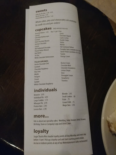 Fantastic. Stumbled in one night after a few drinks in Atlanta wanting some dessert. The restaurant I was at had a mediocre dessert menu. Sugar Shack popped up after googling "dessert spots in Atlanta". Service was quick and friendly, with a great selection of cookies, cupcakes, full size cake and other sweets. Havent tried their regular menu food. I liked this place and their service so much that I special ordered a cake for a coworker(for her last day) and drove 45 min to pick it up. Will continue to visit this place when Im in the area.