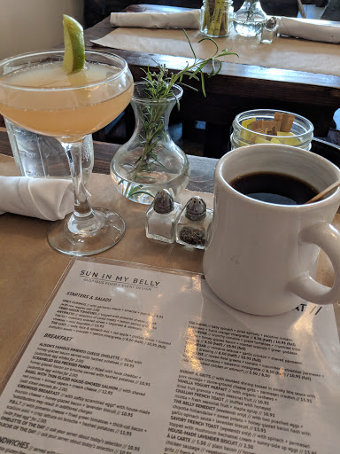 Sun in My Belly is a favorite spot. Ive hosted birthday celebrations, taken out of town friends, and recommended this place to multiple friends. I really hope we visited on an off day. Otherwise, I am really disappointed. We showed up at noon for Sunday brunch. I was very pleased that we didnt have to wait for a table-- which is a bit unusual. Once seated, we noticed flies--a lot of them in the restaurant. This was a major turn off. It wasnt just one or two, either. This is understandable with the doors constantly opening. Still, I wasnt about to have any meat. Next, came our entrees. My dining companion had a salad. He complained (to me) of unwashed greens. I sampled. He was right. They were gritty. I had the new menu item -- purple potato salad. It was delicious-- but I had a gritty forkful too. Finally, I was offered a refill on my tea. My tea was refilled (replaced) with room temperature tea with no ice. I still love SIMB. But guys, please do better than this.