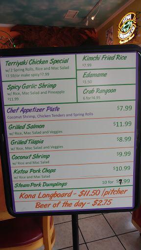 Large price for small portions...Variety okay - Atmosphere good - Food good - Prices...not so good. The staff is great but the owner tries too hard & is too touchy! I just wish he would represent Hawaii for what it really is...not the grass skirts & plastic leis - we dont even wear those things. My feeling is, when you represent yourself and/or a culture - do it correct. Better to just buy a cook book from Hawaii and make the food yourself. Honestly, its not worth the drive.