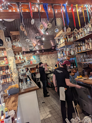 This place is really cool!! Located in the back of a real cool looking building, and it had a very underground-brewery vibe going. The whole inside was decorated in stone and had darker lighting. The cocktails were made ever so precisely/elegantly... they are truly craft cocktails!! The bartenders were hard at work and seemed very good at their job!! (they more than quadruple-tasked at one time). The food seemed a bit overpriced, but it smelled AMAZING!!!!! I only ordered the cheese dip with a pretzel and vegetables, which was pretty good. I just wish I was more hungry for real food since it smelled so good!!!! This place is located slightly out of the area of all of the other bars and places, but it was just a short walk for me.