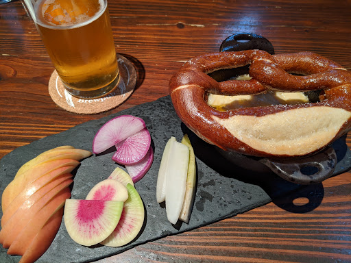 Brewpub set inside the basement of a vintage home (event space). Exposed stone throughout. Table seating throughout the room, anchored by a decent sized bar in 1 corner ( seating around 1/2 of the bar ). Very cool setting. Nice beer selection from their adjacent brewery. Out of 5 different visits over the last 2 years, I would recommend sitting at the bar for the best service at any time. Table service can be hit or miss as far as time spent on waiting for servers. The food was delicious 4 out of 5 visits; last meal was cool and undercooked, combined with long wait and inattentive server ( we sat at a table )