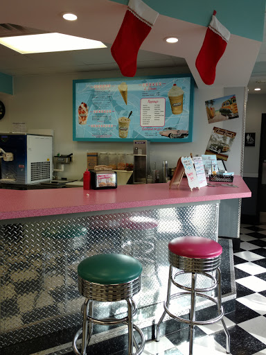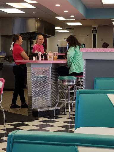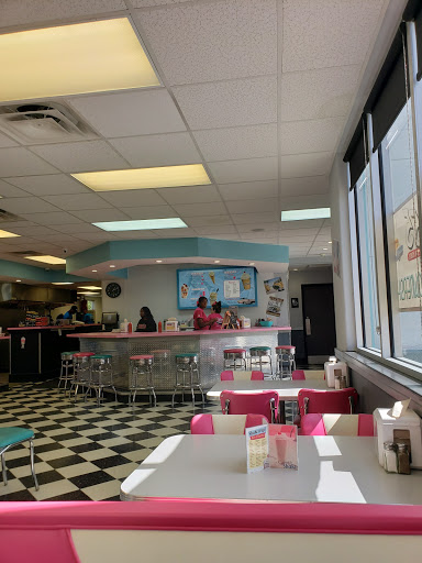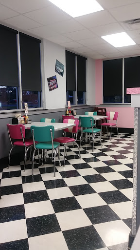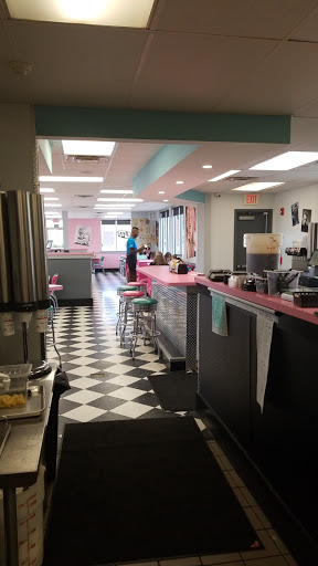 Food was decent, but service was far from decent. We walked in, no signs to indicate if we should seat ourselves, or wait for someone. The girl working behind the counter didnt say anything to us, even after we just sat ourselves at the shake counter she was working at. We waited there a solid 5 minutes before she even addressed us. We received our food from another server, and had to flag down another server just to get our drinks. I give it 2 stars bc the place was cute, but a very girly 1950s diner with bubblegum pink and turquoise everywhere. There were only three 50s icons icons plastered multiple times on the walls though which I found humorous. Guess they only liked Elvis, Marilyn, and James Dean.... or they dont really know much about the 50s. Lol