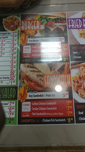 Huge menu with everything from hot wings 2 euros and even fried rice. You can mix and match sides with entrees and the portion sizes are very large. Their wings are unmatched by any other chain restaurant as far as Im concerned