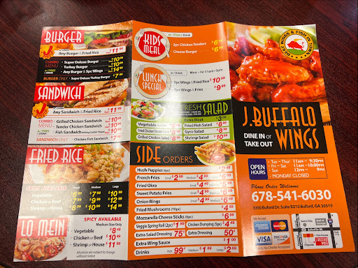 I eat here once a week. Their wings are fresh, their sauce is delicious, and unique. My favorite wing sauces are #1. Three Dollar Cafe, #2 J. Buffalo, #3. J.R. Crickets, #4 Taco Mac. Many restaurants just have a generic "red Hot" based sauce. These are much more. J. Buffalos also understands the perfect "Sauce to Chicken Ratio". Too big of a wing, and the whole balance is thrown off. These are not those little micro pigeon wings some places sell, but not those drumsticks the size of a Renaissance Fair Turkey leg. Theyre just right. Ask for them a little extra crispy, and youll be in heaven. They take about 10 minutes to cook to order, so call ahead if youre in a hurry. The only other thing Ive personally tried is the Chicken Buffalo Philly. Yum! Its hard to eat wings on the road, so if Ive got to eat on the run, I get the Philly! I have visited about 4 of their locations so far, and I can say that their food is consistent.