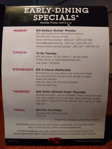 I went last Thursday for my anniversary and the food was horrible.... But my server I had was awesome he did everything he could to make our night better . But for the price we spent Id rather went h it wouldve been cheaper and at least Id been full when I left . But we thought we go have a nice dinner just me and her without the kids for once. Boy were we wrong . The food was either under cooked or very over cooked . Our portions were very small . I ordered king crab legs and they were smaller than snow crab legs it was ridiculous. My wife ordered a steak in substituted the crab legs and her steak was so over cooked u couldve used it for a hockey puck . So when u spend over a hundred dollars on. Meal your expectations are a little higher. But like I said our waiter was awesome he did all he could to make things a little better. I dont recommend going there if u want good food . This is the Red Lobster in Canton GA .