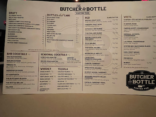 My husband and I (along with our two kids) decided to try Butcher and Bottle for the first time tonight. We had had their wings at the Rock and Wing fest over the summer. We were both disappointed. The chile wings were great as an appetizer, gave us high hopes that were quickly dimished. Filet medallions we ordered medium rare were raw, cold center- so raw the peppercorn "crust" was a wet rub. The creamed corn was good but very spicy- almost too spicy to enjoy. Green beans were overcooked. Our kids had the kids Filet and fried shrimp. Fried shrimp were very good, but my daughters Filet was also ordered medium rare and came out so raw/cold she didnt like it. For dessert we ordered the flour less chocolate cake which was good, but not news worthy and the mini donuts which tasted like what youd get from a kids cake pop maker. The service was good, no complaints about the waiter, other than that he forgot to mention there were specials which we didnt realize until a new table sat next to us. Steak knife they gave me was dirty (dirty and rusty...), as was one of the dessert plates which had someone elses spinach?! dried on it. Overall not worth the experience. Its a great location, beautiful interior, and great concept- but theyre dropping the ball.