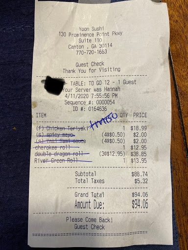 The sushi at Yoon Sushi is nothing to write home about. It may seem expensive on first glance, but the portions are bigger than many sushi restaurants. We visited on a Saturday night and it was not very busy. Especially with the low traffic, the service was not very good. We were not hardly ever checked on by the young waitress as we sat at the sushi bar. I had to waive to get her attention when we needed something. All of the wait staff never cracked a smile at anyone. I dont think we will be returning. We will continue to make the drive to our favorite sushi restaurant in Alpharetta.