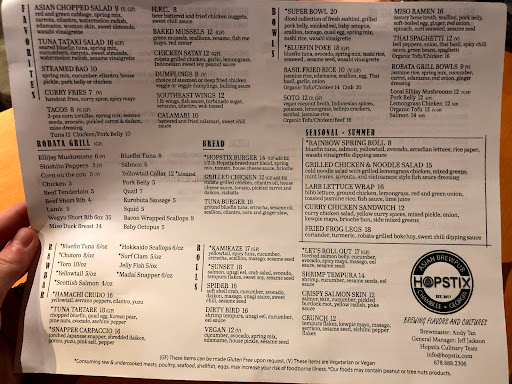 The freshest food Ive had in Atlanta. I love the food so much I went there 2x in one week and I live 30 miles away from this restaurant. If you want salty or greasy food, this place is not for you but if you crave for food that is prepared with care, give Hopstix a try. The robata grilled duck is delish. If you love sushi and sashimi like I do and cant decide what do get, let chef Donny surprise you. Some of the pictures I uploaded are not on the menu.