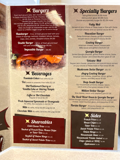 Great burgers and a good staff. They are not afraid to try different styles of burgers. Loved the one with the grilled peaches on it.