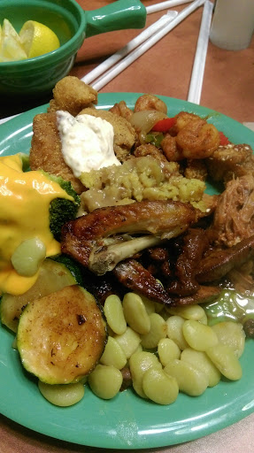 I had never been to Golden Corral before and I have to admit that the commercials got me. I was excited to go there for the first time. I am sad to say that now that I have been, I will not be back. This is not a place for people who value quality over quantity. I did not like anything that I tried. Not one single item was good. All the food was bland! There was no flavor to the seafood items I tried and the chicken I tried was disgusting! The texture was rubber and flavor was so nasty I spit it into a napkin immediately. I thought I could at least make a nice salad at the bar, but even that was disappointing. There was a limited variety of toppings and the vegetables looked unappealing. Things were mixed together from people dropping things into other containers. It was gross. I wish I would have took my money elsewhere. I feel that I wasted my money. $15 is too expensive for tasteless cafeteria food. The only thing that was alright was the service. The server tried to accommodate the large party I was with to the point of overdoing it. My daughter got 3 glasses of soda almost back to back, while I never got a refill on my sweet tea. I gave her a pass though, she was working hard and probably not getting paid much on top of it. Overall this is not the place for me, I dont eat, just to eat or just to be full. I like food that tastes good and it not a bunch of cheap, over processed crap.