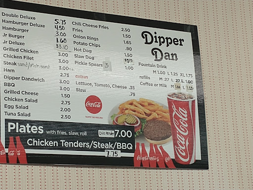 Dipper Dan has the best fresh hamburgers, hot dogs, chicken tenders, french fries, onion rings, & slaw, prices are excellent!