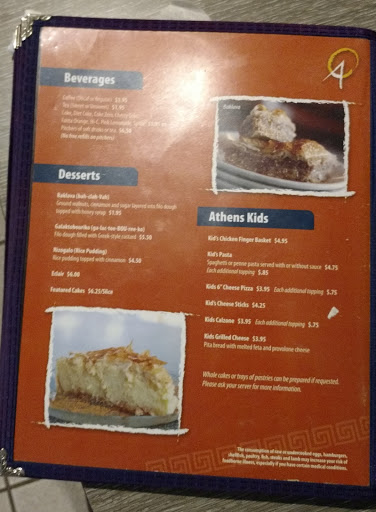 Ive lived in metro Atlanta over 45 years, and Athens Pizza has been my go-to spot for Greek food and Greek-style pizza. My wife is especially crazy about their Greek salads, and Im really fond of their gyro plate, with Greek salad and home fries. They bake their own baklava (at least I think they still do -- Im positive they certainly did when I first started eating their in 1968, because I watched it being prepared from scratch). This is something I really LOVE, and theirs is the best Ive ever had! All the dishes that Ive tried have been very good to superior, and the prices are quite reasonable for the quality of the food. Service is most often very friendly, but often slows considerably during their busiest hours. The one negative Ive noted: this is generally not a good spot for a quiet, intimate dinner for two. The noise level can interfere with conversation, causing people to raise their voices so they can be heard above the background noise. This, of course, just adds to the noise, and when the place is packed, the process feeds on itself. My wife and I prefer take-out service during their busiest hours, and the food makes take-out service more than worthwhile.