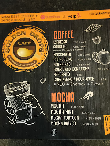 I had a wonderful experience at Golden Drops! Not only was the Golden Latte phenomenal, but I enjoyed talking to Victor about his El Salvadorian roots and how the coffee is prepared. I would highly recommend this coffee shop to anyone in the Decatur area.