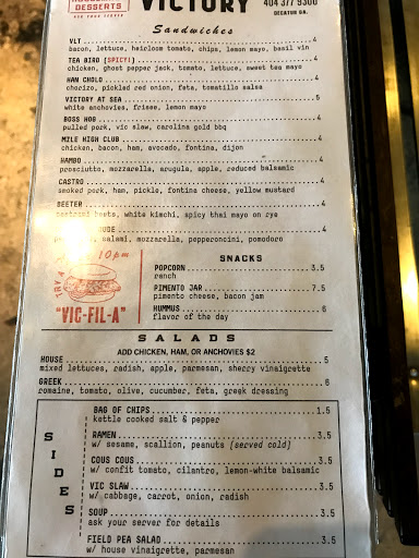 This place seems like its geared toward struggling hipsters and college students, which is fine, but it shows in the quality of their sandwiches. The only one I actually enjoyed was the "Porkemon" BBQ sandwich. All the others arent particularly good (but I guess thats indicative of the $4 price per sandwich). I would go back for the BBQ sandwich, but Id have to go by myself since my coworkers have refused to ever go back again. Victory isnt necessarily bad, just very, very mediocre and underwhelming. You can make better sandwiches in your own kitchen.