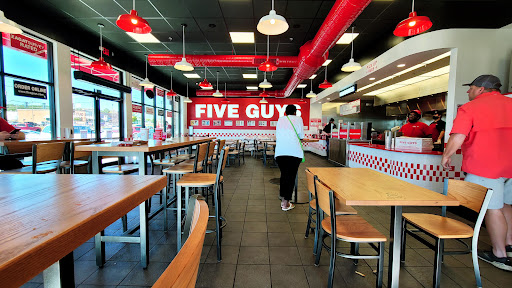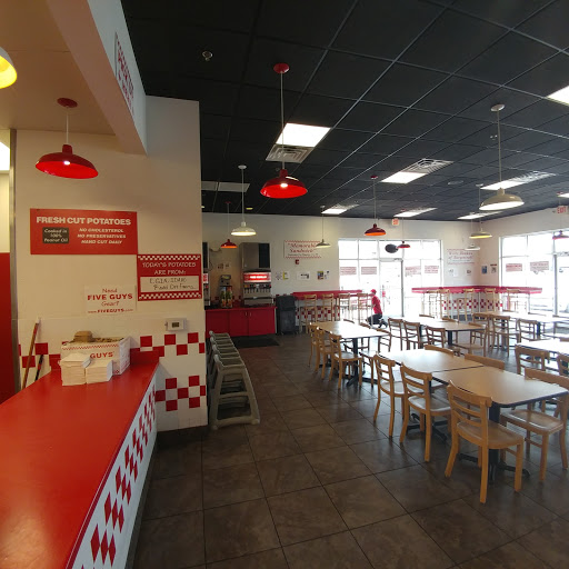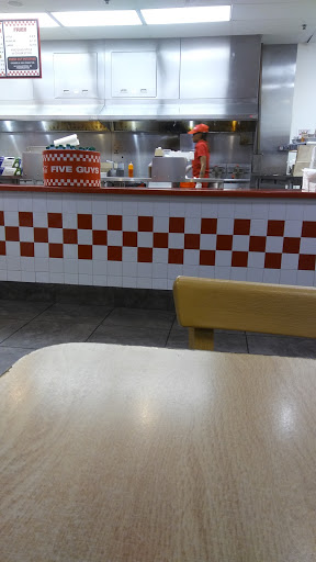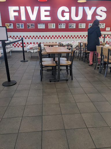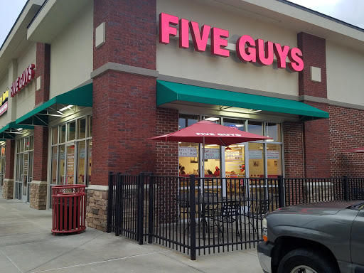 Five Guys is a good location for a decent burger. Some pros: - free peanuts - large variety of burger toppings - overflowing fries Unfortunately they 1) dont have a kids menu 2) dont have a ton of variety on the menu 3) they are not the cheapest place to get a burger. This location is never terribly busy, they have some limited outdoor seating, and the location is easy to see from the road. The location access is not the easiest to get into...you have to be specifically going to the location.